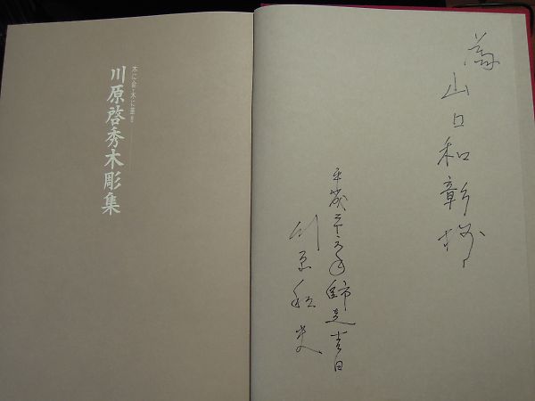 持参した「川原啓秀木彫集」に、直筆でサインまでいただきました。
