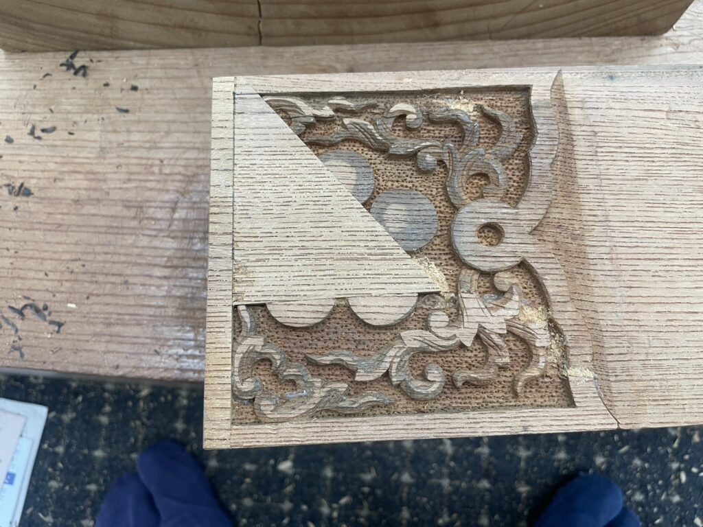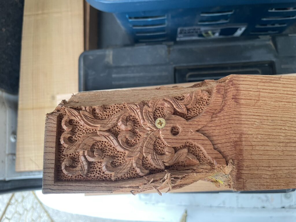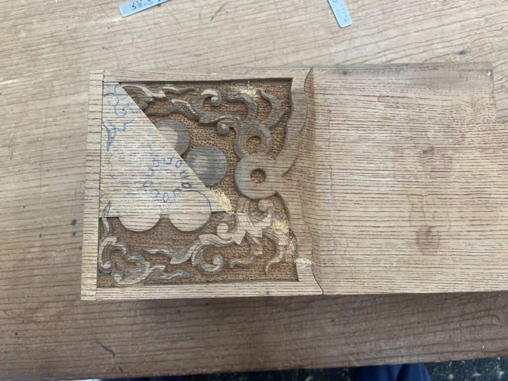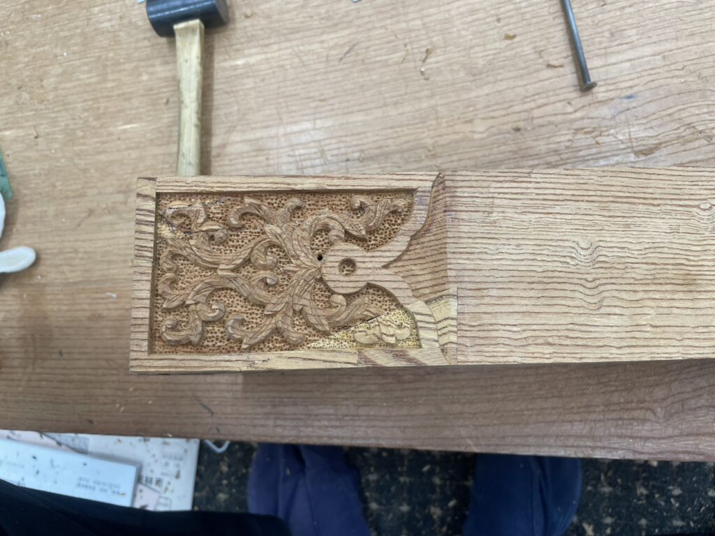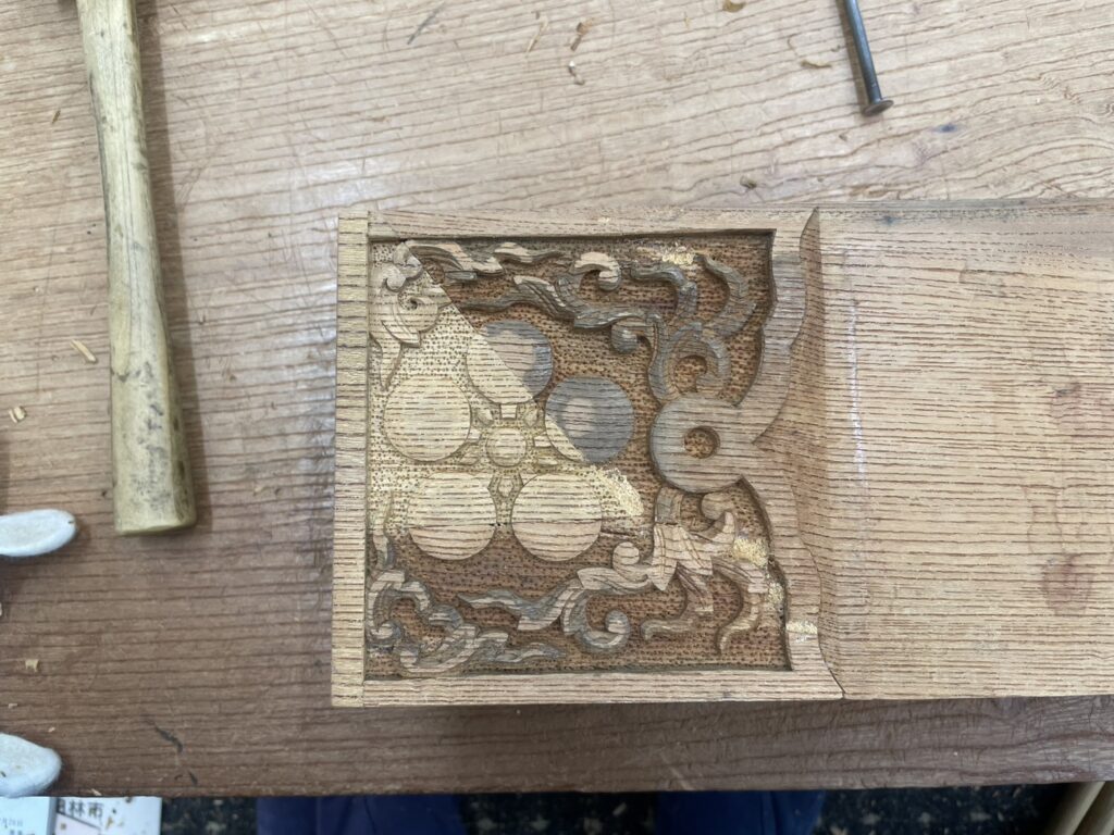 大工さんの手により、欠損部分に杢目を合わせて新しい材木を貼り付けます。