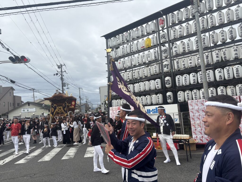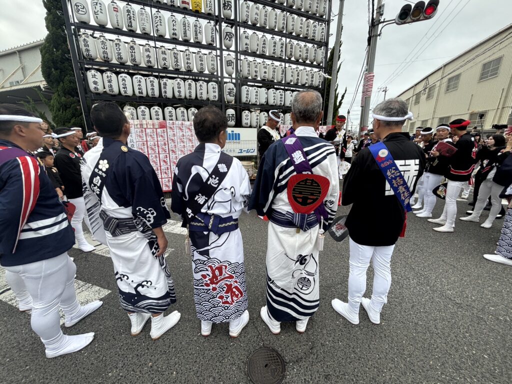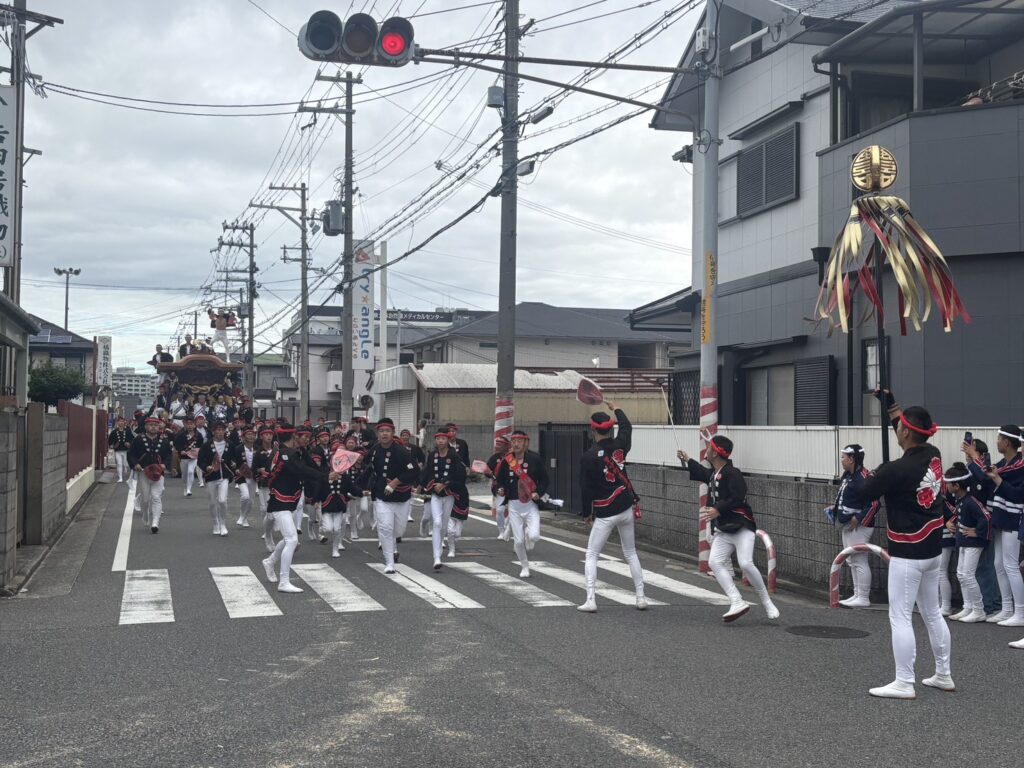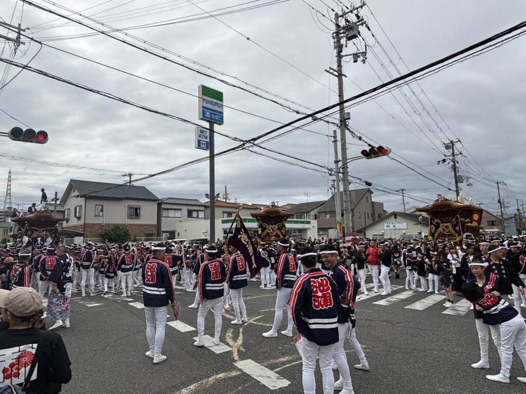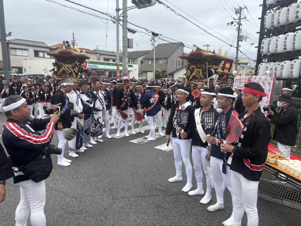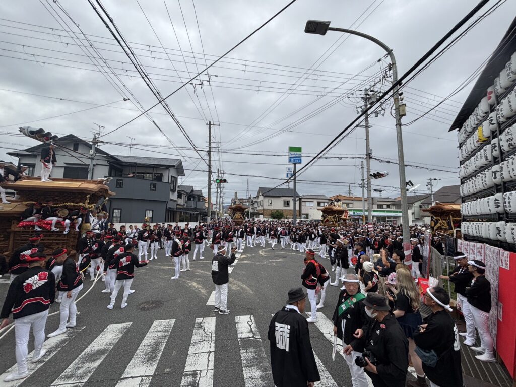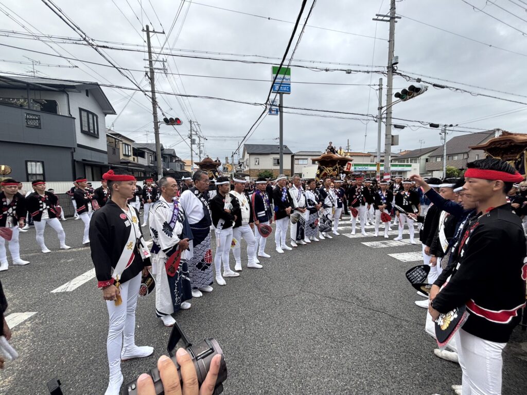 少しの町内曳行のあと、板原町ファミリーマート(板ファミ)前にて4町が揃ってパレードが行われます。