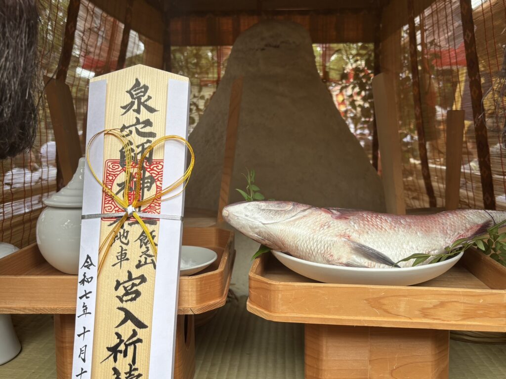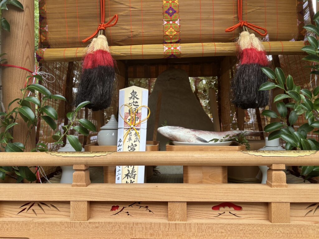 正面のすだれ越しに、中に盛られたご飯(もち米)とお供え物をチェック。