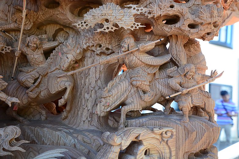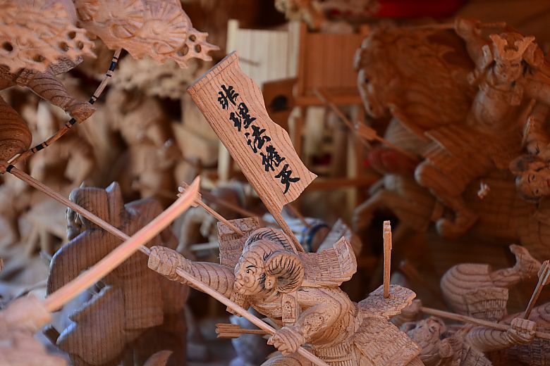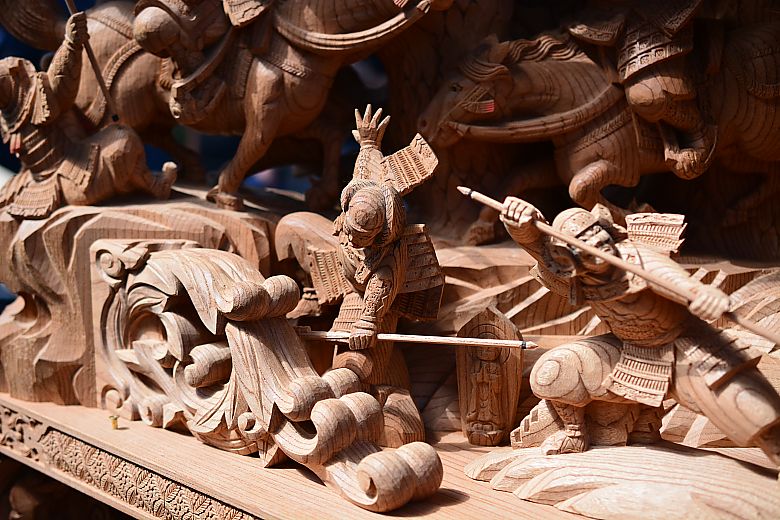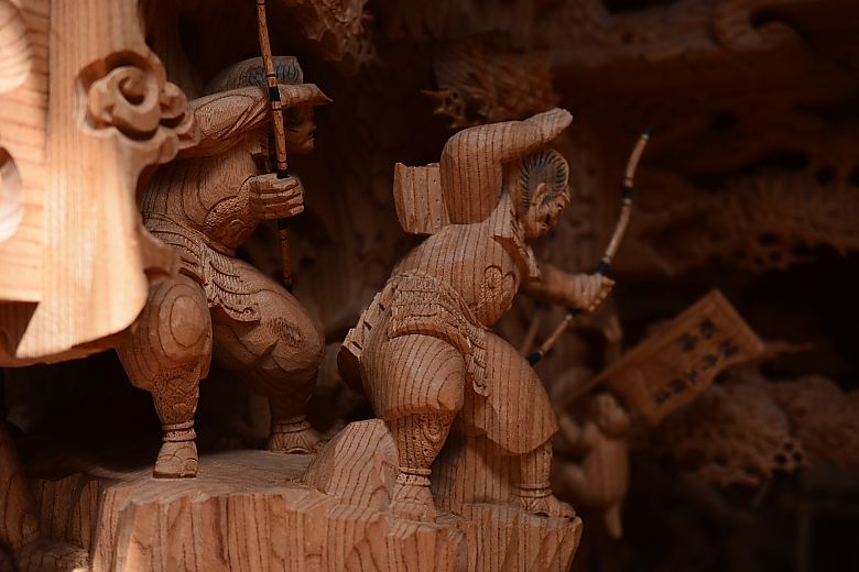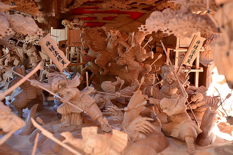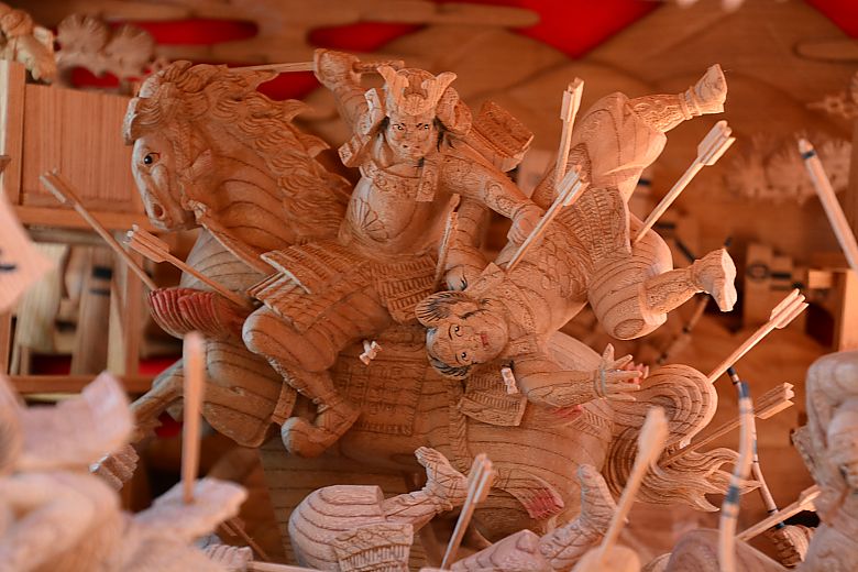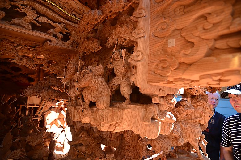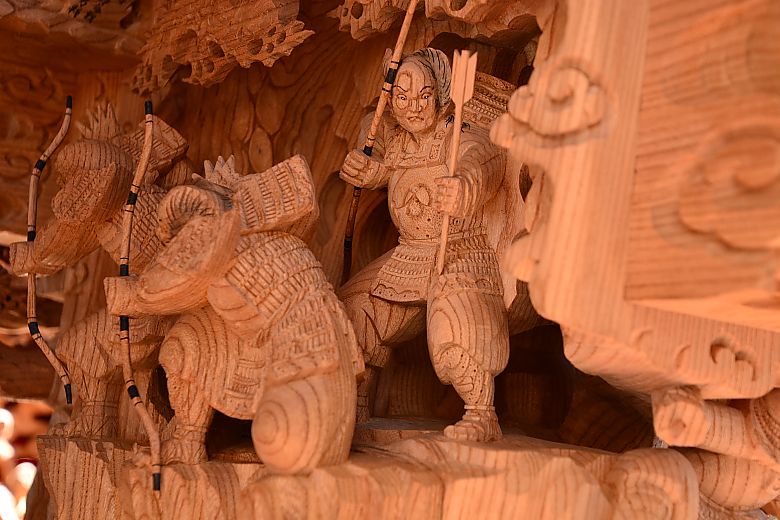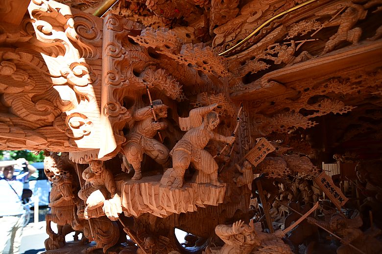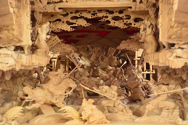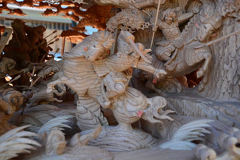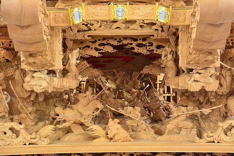 地車後方の姿見から順にセンター(馬乗り:楠木正行)へと迫っていく構図。