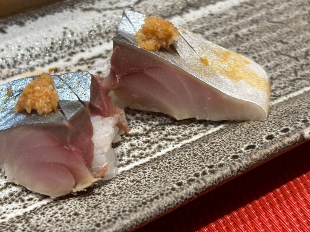 厚切りのサバを握りで。