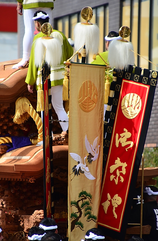 吊り下げ町名幟の裏面にも、美しい鶴と松の刺繍が施されていました。