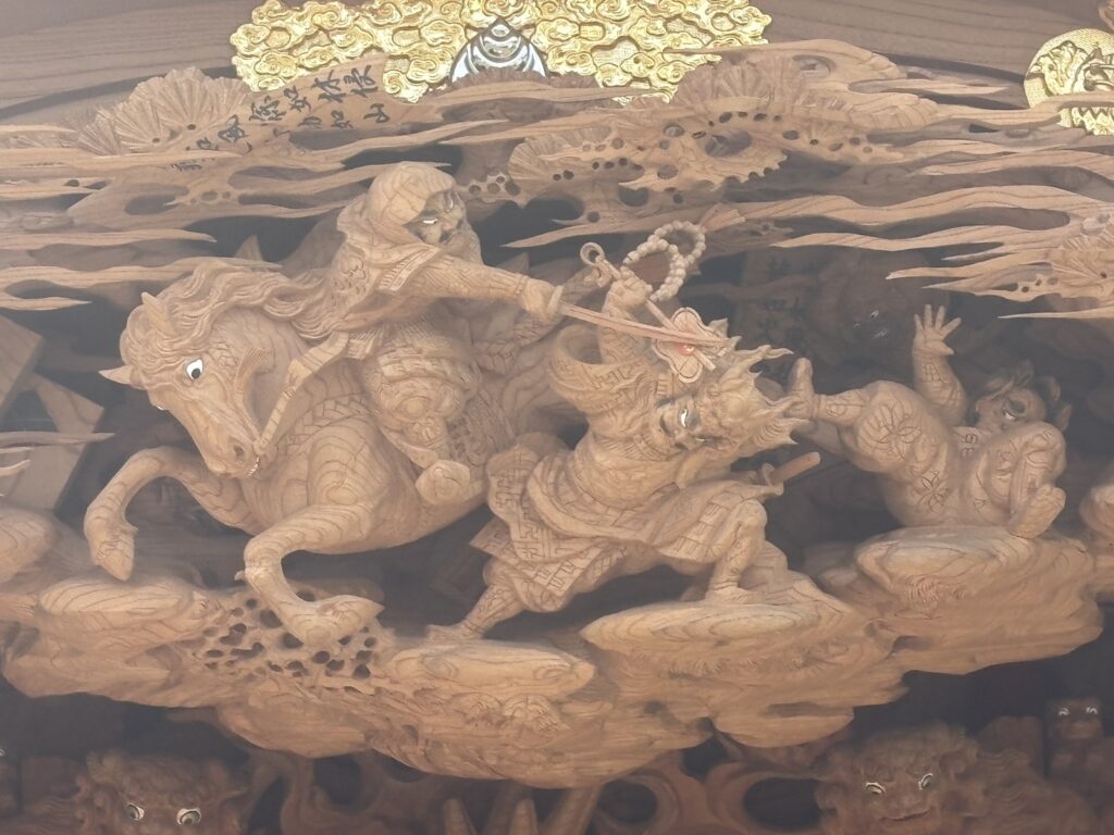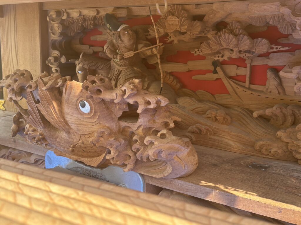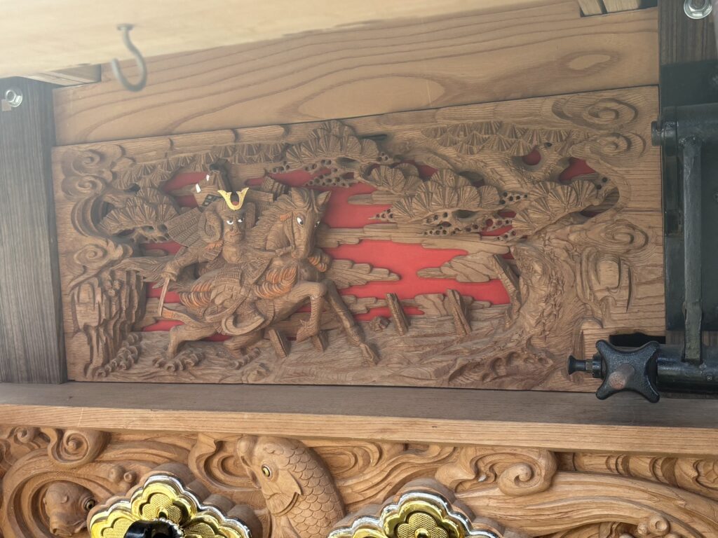 脇障子(左右)です。その側面には「獅子の子落とし」と「鯉の滝登り」が一対で彫られています。